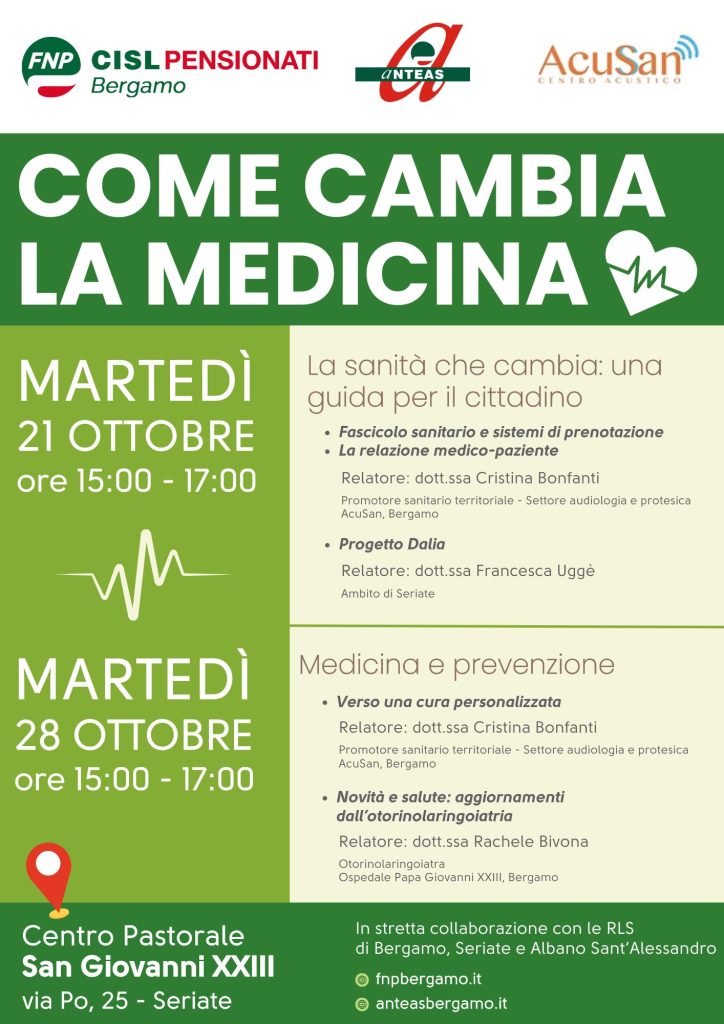 FNP CISL Pensionati di Bergamo, in collaborazione con ANTEAS e Centro ACUSAN di Seriate, organizza una serie di incontri dal titolo “Come cambia la medicina”.