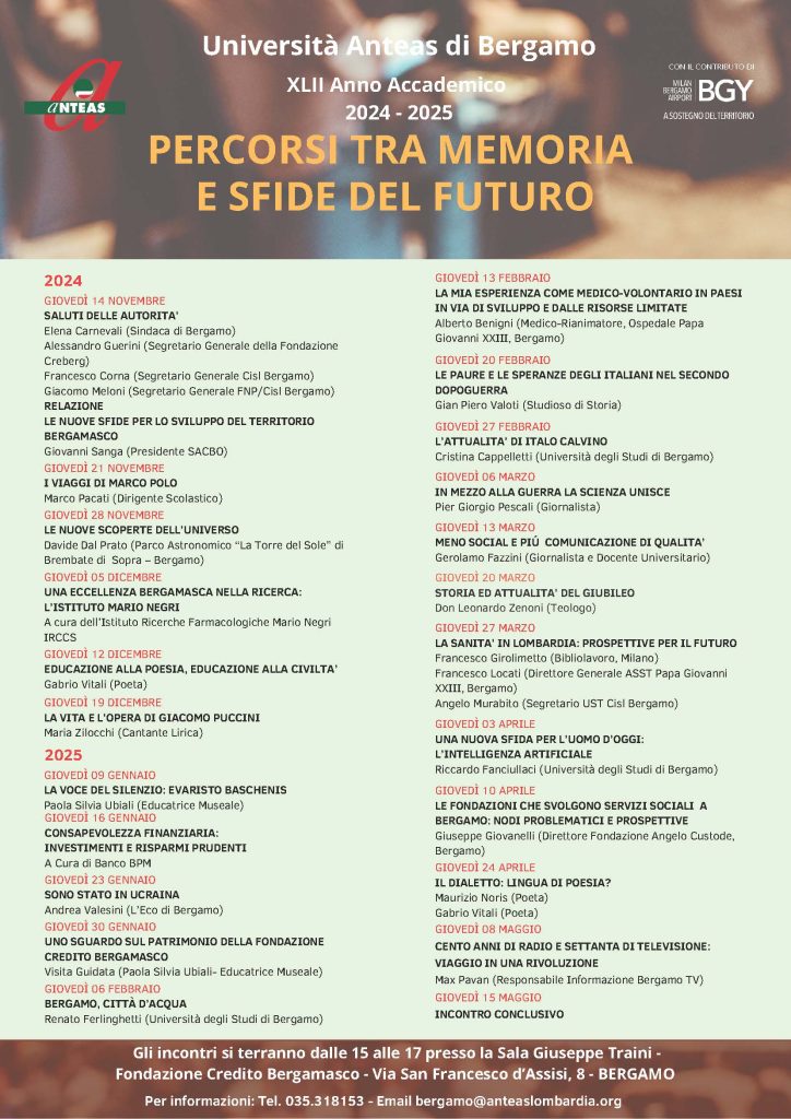 Per quest’anno sono state introdotte importanti novità: la prima riguarda la sede degli incontri che viene sposata presso la sala Giuseppe Traini Fondazione Credito Bergamasco in via S. Francesco d’Assisi n. 8 Bergamo. È in un edificio situato dietro la Chiesa di S. Maria Delle Grazie. L’altra prevede che la quota di iscrizione è fissata in 65 € compresa la quota tessera di socio Anteas per l’anno 2025. Tale scelta è stata possibile grazie alla fattiva collaborazione di Sacbo Bergamo, della Fondazione Creberg di Bergamo e di Banco Popolare di Milano.